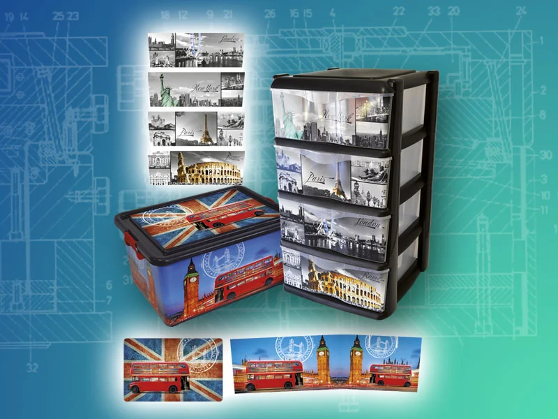Cajas, apilables y una amplia gama de productos con las que guardar tus objetos pueden llevar las etiquetas IML, no importa si de interior o exterior, su resistencia aguanta perfectamente.