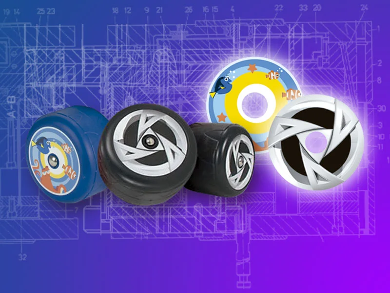 Que los juguetes sufren un gran desgaste no es ningún secreto. Combinando la extrusión de soplado con IML conseguimos una gran resistencia en elementos como son las ruedas de vehículos infantiles.